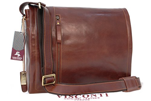 Style: VT5 Enzo. Vintage vegetable tanned leather has that dark and sultry look about it. This Visconti product is made from the finest leather and has that wonderful new leather aroma. Leather items may have wrinkles, scars, scratches that are inherent characteristics and natural beauty of the hide. This is strong, high quality leather and with its smooth polished surface and distressed antique finish, there's no doubt that this briefcase has plenty of attitude. If you covet the look of old, comfortably worn-in leather you won't have to wait the years it takes for the look to develop naturally as the leather has been specially prepared so that it takes on that much coveted, vintage effect much more quickly. The surface is designed to scratch easily but these marks will gently blend in over time adding to the character of the bag. Please remember that as leather is a natural product, the intensity of the colour will vary slightly from hide to hide during the dyeing process, making each bag totally unique. This is a big bag with good capacity and plenty of pockets; it can accommodate A4 sized note books, files and document wallets. Can hold laptops up to 35x24.5x3cm. The long adjustable strap is made from leather topped hardwearing polyester and has a sliding shoulder grip for comfort when carrying heavy loads. Wear either on the shoulder or hands-free, across-body. The main flap is luxuriously lined with suede.